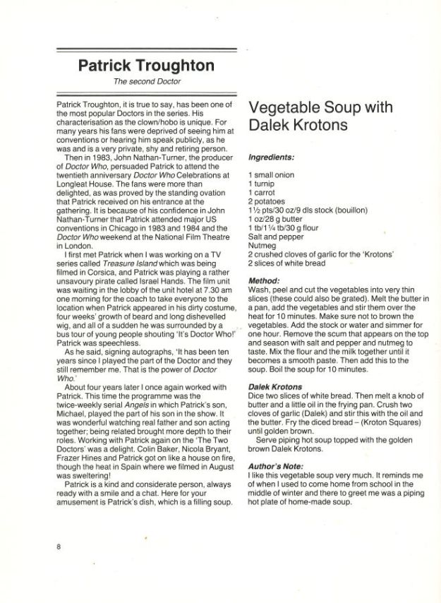 There’s a Dalek Bake with Exterminate Topping recipe provided by John Scott Martin, who was a veteran Dalek operator in ‘Doctor Who’. And there’s a recipe called Sole Suzanne provided by Faith Brown, who played Flast, one of the Cyrons (which one, I don’t know) in ‘Attack of the Cybermen’. 🙂