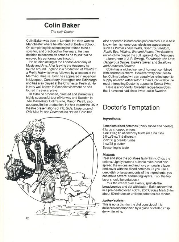 Mat Irvine, a visual effects designer in the classic ‘Doctor Who’ series, gives his Pirate Paella recipe in the cookbook. John Stratton – yes, the actor who played Shockeye of the Quawncing Grig in ‘The Two Doctors’ – gives us his Coley Anorexique recipe. Thankfully, it’s a fish dish, not a human dish. 😀