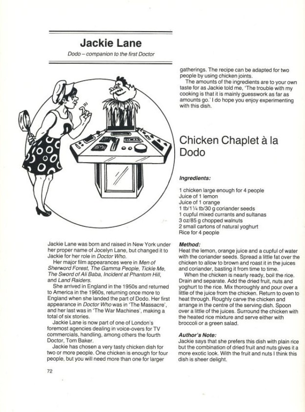 There’s a Chicken Chaplet à la Dodo recipe provided by Jackie Lane, who played Dodo in the TV series. There’s a Grilled Breasts of Chicken à l’Azmael recipe provided by Maurice Denham, who played Azmael in ‘The Twin Dilemma’. Amazing how these recipes are named after ‘Doctor Who’ characters. 😀