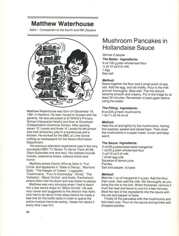 That happens to be Mushroom Pancakes in Hollandaise Sauce. Louise Jameson, who plays Leela in ‘Doctor Who’, provides us her recipe of Leela’s Savage Savoury. Thinking about all these recipes provided in the cookbook so far, I wonder if anyone has tried them all to find out what they’re like. 🙂