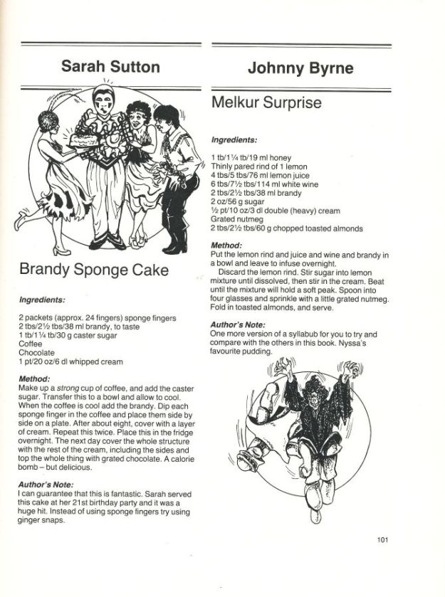 Writer Johnny Byrne gives us his Melkur Surprise dessert recipe. According to the author’s note, this is Nyssa’s favourite pudding. 😐 John Leeson, who voices K-9 in the TV series, provides his Brown Bread Ice Cream dessert recipe. And Terry Molloy provides us Davros’s Extermination Pudding recipe.