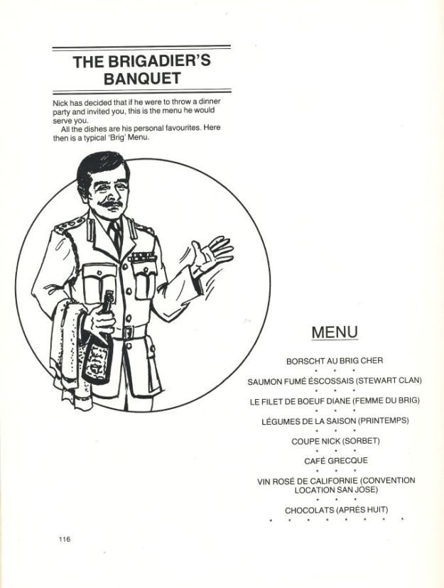 The book ends with Nicholas Courtney providing us with The Brigadier’s Banquet, which is what he would provide if he invited you to one of his dinner parties. The menu includes Borscht au Brig Cher, Saumon Fumé Écossais (Stewart Clan), Le Filet de Boeuf Diane (Femme Du Brig), Légumes de la Saison (Printemps), Coupe Nick (Sorbet), Café Grecque, Vin Rosé de Californie (Convention Location San Jose) and Chocolats (Aprés Huit). Nick Courtney in ‘French Fields’ comes to my mind. 😀