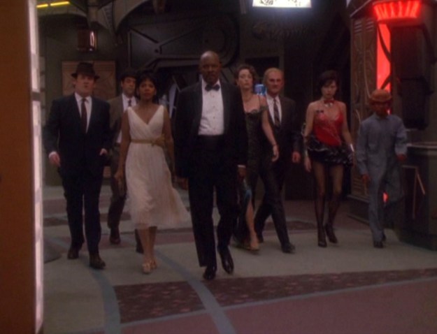 Kasidy wins Sisko around and he eventually agrees to help with getting Vic Fontaine’s hotel lounge back. Pretty soon, the Vic Fontaine group gather in his hotel room to form a plan to defeat Frankie. 🙂