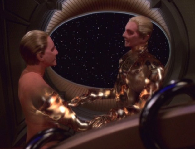 Things aren’t helped when Salome Jens as the Female Changeling turns up to visit Odo on DS9. She hopes to spend some time with him, while Odo is grudging about what the Changelings did to him. 😦