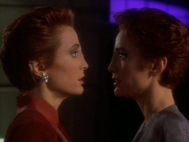 Throughout the episode, Intendant Kira tries to seduce Major Kira to be closer to her and that she has nothing to fear. It’s almost lesbian in a way. Typical though. Kira Nerys is falling in love with herself. 😀