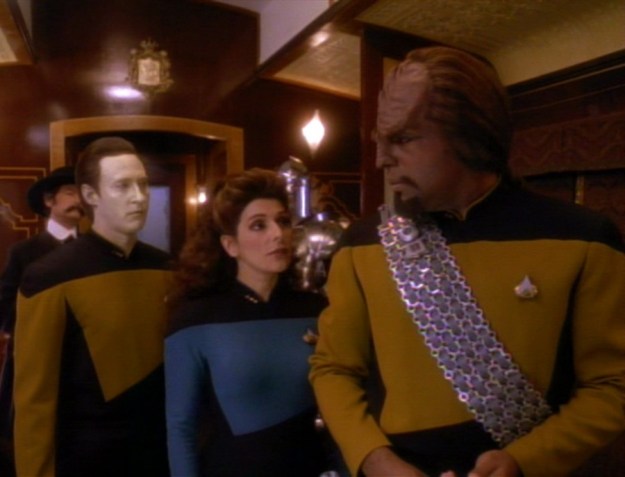 Data, Worf and Deanna make a second visit to the holodeck to learn more about what’s going on. They soon follow the gangster character when the train stops at Keystone City as we go in the open.