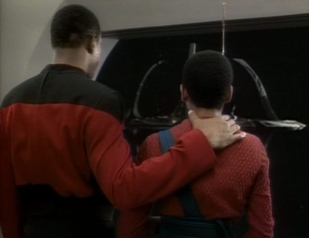 O’Brien has the brunt of the work laid upon him regarding repairs to the station. He’s now promoted from transporter chief of the Enterprise-D to chief of operations aboard DS9. O’Brien explains the circumstances of DS9’s state of disarray to Sisko once he arrives on the space station with his son Jake.