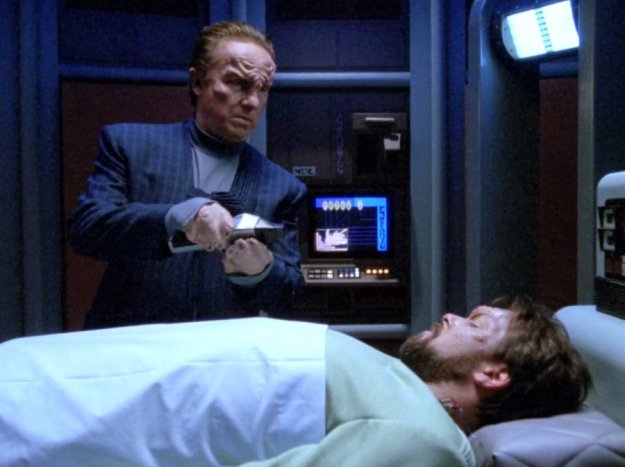 Krola meanwhile fears a hostile invasion by the Federation on their planet. He endangers Riker’s life by reviving him prematurely. He questions Riker, before he frames him to shoot him with his phaser.