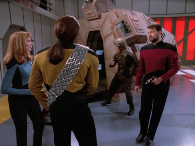 On the mercenary ship, Riker meets the commander, Richard Lunch as Arctus Baran. Baran demands answers from Riker, but Riker refuses to cooperate. Riker then discovers a device has been implanted into his body, which allows Baran to inflict pain on him. What’s ironic is that Riker soon works for him.
