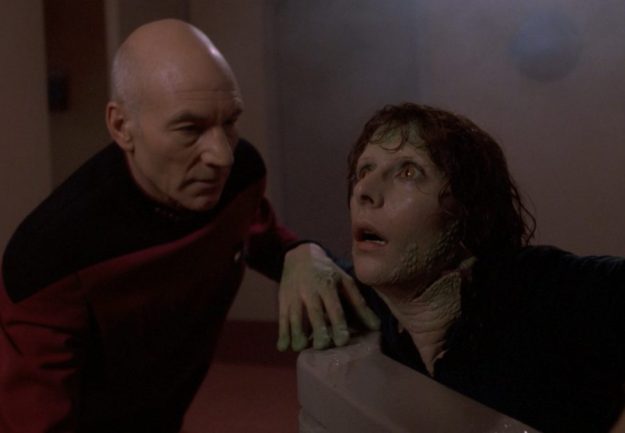 Riker also has trouble concentrating as his brain gets smaller. Beverly also discovers a venom sac on Worf’s neck and he soon sprays venom into her face, injuring her severely before she gets put into stasis.