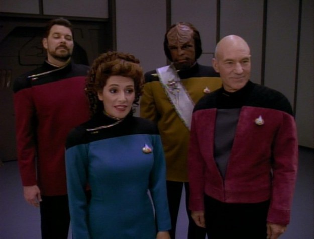 The episode begins with Worf having trouble getting dressed for a diplomatic mission. He doesn’t like having to dress up, saying that the formal wear Starfleet uniforms look like dresses. I agree with Worf.