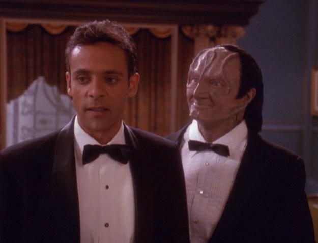 Bashir gets in touch with Eddington and Odo outside. They tell him he can’t shut down his holosuite program or else Sisko, Kira, Dax, O’Brien and Worf will die. So, Bashir must keep his program going. 🙂