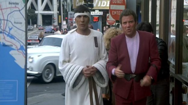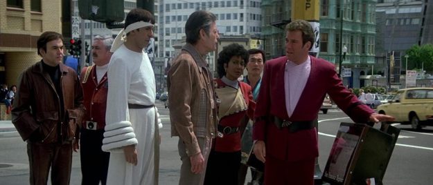 There’s only one way to solve this situation. Kirk and the Enterprise crew must travel back in time to Earth’s past to find and recover some humpback whales and to bring them forward into the future. This they do, and the Enterprise crew in the Klingon ship soon end up back on Earth in the year 1986.