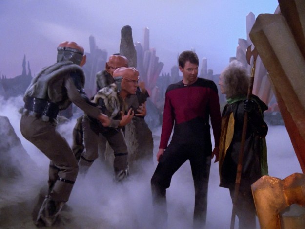Eventually, Riker with his away team of Data, Geordi, Worf and Tasha beam down to the planet. They’re soon attacked by the Ferengi. Can Riker and his away team find a way to free the Enterprise?