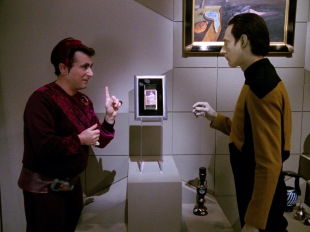 Most of the episode with Data has him protesting to Fajo that he won’t comply with his wishes and is determined to return to the Enterprise. Fajo treats him like a prize and doesn’t acknowledge him.