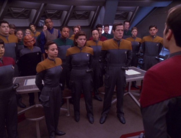 Jake and Nog are surprised to find the crew are all members of Red Squad. This was the elite squadron of Starfleet cadets introduced in ‘Homefront’/’Paradise Lost’. The crew were on a training mission. 😐