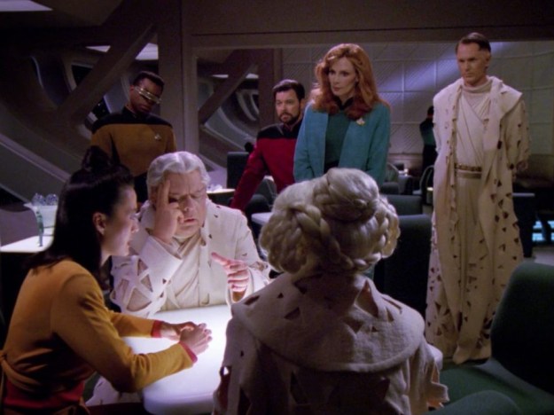 The Ullians are soon submitted to some medical tests to make sure they aren’t carrying any harmful toxins or pathogens. I liked that scene in sick bay where Riker tries to talk to Deanna in her coma state.