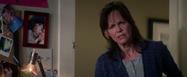 Sally Field returns as Aunt May. Aunt May constantly dotes on Peter whenever he’s home, as she shows concern for him. I found that scene funny where he’s hiding under the bedclothes with his Spidey costume on and she notices how filthy his face is. His excuse for it is very pathetic, mind you.