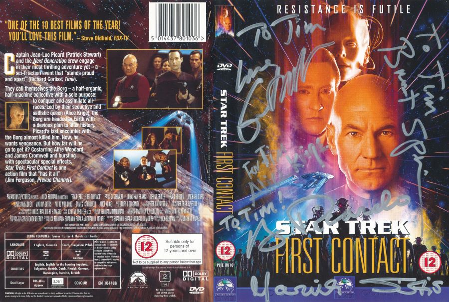 star trek first contact dvd signed by brent spiner, gates mcfadden, marina sirtis, alice krige and robert picardo ← Previous Next → Tim Bradley’s original DVD cover of ‘Star Trek: First Contact’ signed by Brent Spiner, Gates McFadden, Marina Sirtis, Alice Krige and Robert Picardo