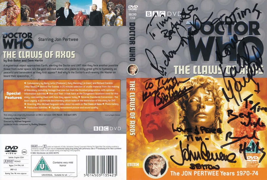 The Claws of Axos (signed by Katy, Richard, John, Bernard and Bob) ← Previous Next → Tim Bradley’s original DVD cover of ‘The Claws of Axos’ signed by Katy Manning, Richard Franklin, John Levene, Bernard Holley and co-writer Bob Baker