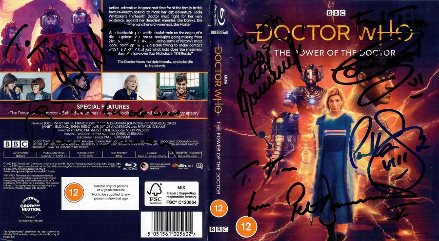 Tim Bradley’s Blu-ray cover #2 of ‘The Power of the Doctor’ signed by David Bradley, Katy Manning, Peter Davison, Colin Baker, Paul McGann and Jo Martin